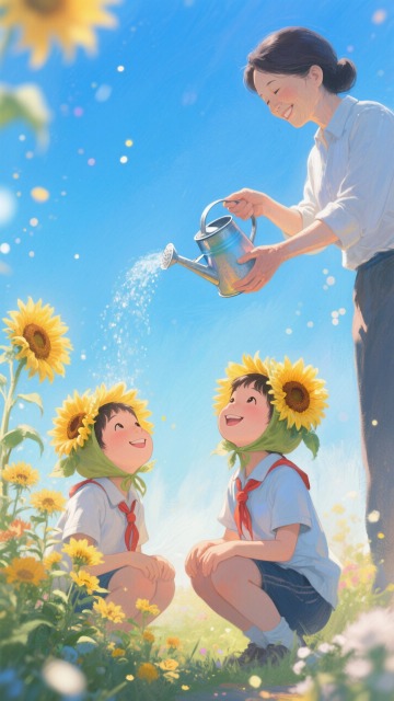 大面积蓝色渐变天空背景。下方远景一位老师提着浇花壶,花壶对着两个小学生(戴向日葵头套,表情愉悦)头顶,学生蹲在花丛边,抬头。唯美治愈氛围。