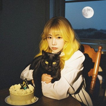 一个女生抱着黑猫,白色衬衫,黄色短发,蛋糕,月亮,蝴蝶,房间角落