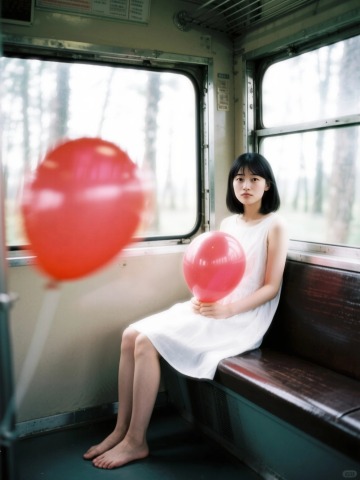 前景飘过一个动态模糊的红色气球,电车车厢内,少女(白裙子,光脚,胸前拿着巨大红色气球)靠在窗边。窗外是树林。面无表情的看镜头。