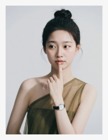 一个女生,橄榄色薄纱斜肩无袖衣服,丸子头,手指点着下巴,戴手表,低饱和度,加强阴影,白色背景。