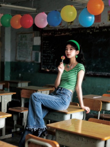 复古暗调的教室,屋顶是五颜六色的气球,女生(绿色条纹上衣,修身做旧牛仔马蹄裤,戴绿色发箍,千禧年配饰)靠坐在课桌上,手里拿着棒棒糖。看镜头。