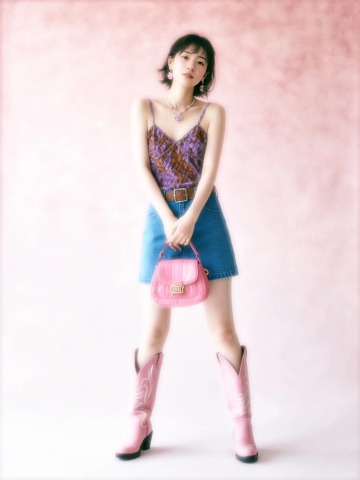 低饱和粉色纹理渐变背景,女人(紫棕纹理吊带搭配蓝色半身裙,粉色中筒靴,千禧年配饰,玫红色复古腋下包)动作舒展。看镜头。