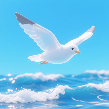 一只海鸥飞在海浪上方,天蓝色背景