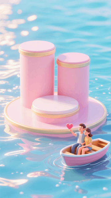 两高一低的三个圆形展台组合,周边充满海水,波光粼粼,(画面右下角的水面有一艘小船,船上坐着一对情侣,发射出爱心信号)。3D卡通风格,微观场景,淡粉色调的场景和背景