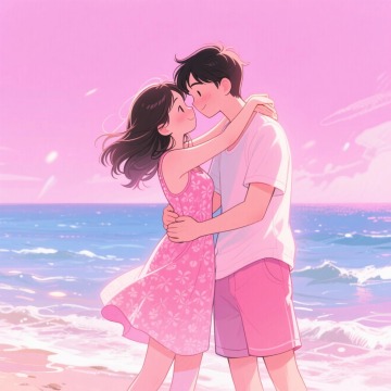 一对情侣互相拥抱,亲昵的姿势,浪漫的氛围,海边,粉色调