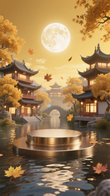 国风虚拟电商场景图。前景是一个圆形金属展台,水面波光粼粼,几片枫叶飘落。背景亮灯的传统中式楼阁建筑群、金黄枫树,金色的天空挂着一轮发光的圆月