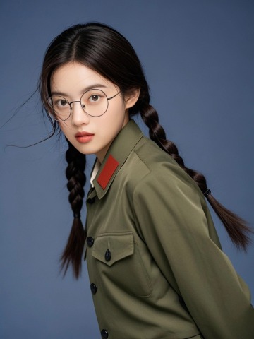 一个长发女生,70年代文艺兵装扮,复古妆容,深蓝色纯色背景,麻花辫