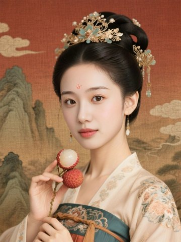 身穿唐代精美纹理服饰,高冷、大眼、丹凤眼、长睫毛、华丽发饰,手持荔枝相关物件,古风影视海报质感,暖棕红渐变背景,融入山水云纹,色调古朴典雅,有传统工笔渲染韵味