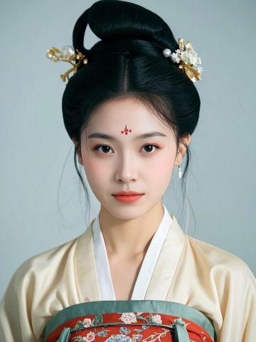 人物梳着唐代发髻,额间画花钿,画弯弯的月棱眉、搭配唐朝小唇妆,眼侧腮红,加上插梳金饰,身穿色彩鲜艳的唐朝女仕服装,手上拿着扇子,古风影视海报质感,暖棕红渐变背景,鎏金山水云纹,整体是浓郁的盛唐气息