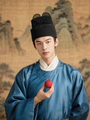 身着精美唐制蓝缎圆领窄袖袍,头戴黑色幞头帽,一手醒目地托着一颗大红荔枝。主体居中,中式古风带现代摄影感,古风元素暖色调,背景山水晕染笔触,营造历史厚重感与故事氛围,不要模糊。