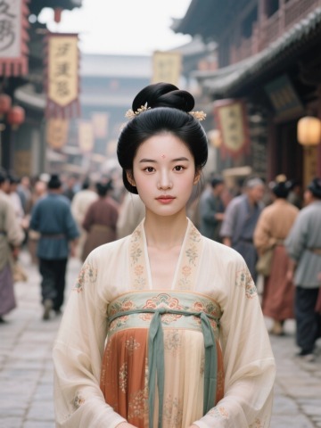 女生正脸看镜头,穿上唐代服饰,贵女打扮,站在唐代繁华的街上,身后是来来往往的唐代百姓,景深效果