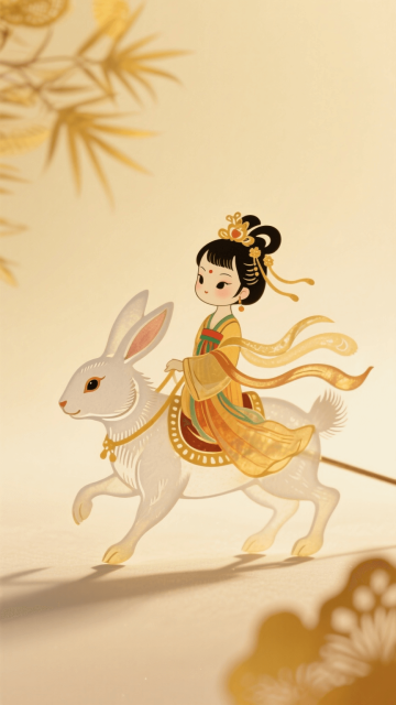 白色的毛绒绒的兔子,驮着一个嫦娥装扮的迷你的Q版小女孩(坐在上面),干净的浅黄色背景