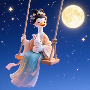 鹅形象拟人化(嫦娥打扮),抱着一只白色的兔子,坐在夜空的秋千上。干净的中秋夜空背景
