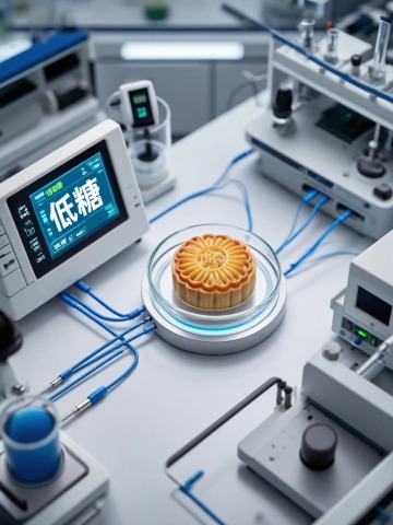 实验室场景,月饼放在中央是电子圆形透明器皿,左边有显示屏显示文案“低糖”。显示屏下方几条蓝色连接线链接到器皿上,四周环绕实验室设备