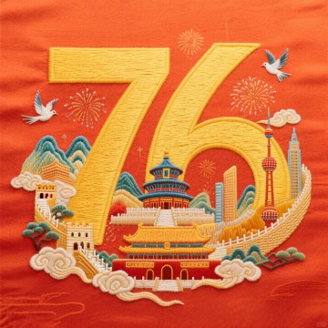 背景是红橙色,四周有花卉、祥云环绕装饰,粗宋体黄色数字 “76“,字周围有云彩,背景是烟火、圆月。下方是天坛、山水、长城、花卉等元素