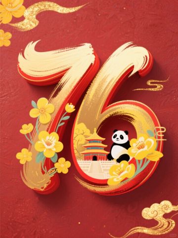 背景是红色搭配中式暗纹,主体是金色艺术感大字“76”,下方有金色艺术感小字“1949-2025”