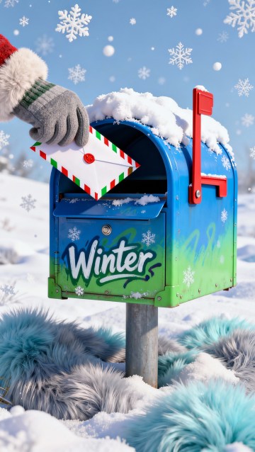 主体为蓝绿渐变的信箱(完整展示,上面涂鸦文字“Winter”,顶部积雪),一只戴着手套的手朝里面放入红绿白条纹的信封,背景在雪地