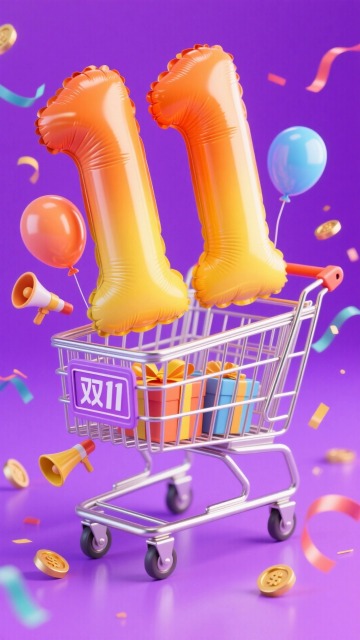 银色购物车里放着橙黄渐变的“11”数字气球(充气膨胀、挤压褶皱)、礼盒、喇叭、气球,车身带“双11”标签,点缀彩带、金币,荧光紫背景