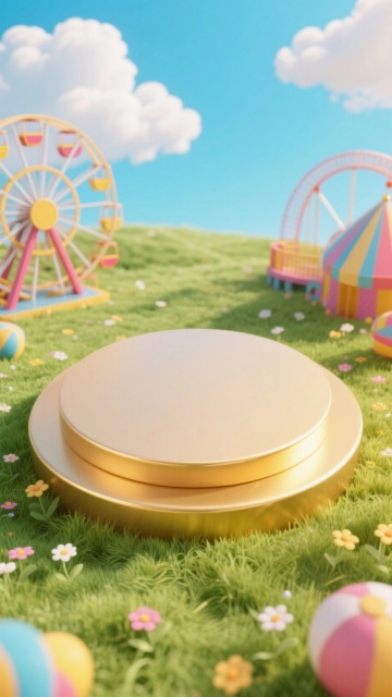 一个圆形的空展台,游乐园背景,小花点缀在草地上,白云,轻微俯视