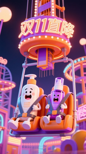 一大瓶拟人化乳液和一大瓶拟人化精华水坐在跳楼机的双人座椅上(有安全带),尖叫的表情,跳楼机顶部写着发光字体“双11直降”。背景是霓虹发光的游乐场,高饱和色调。海报主色调为橘色和紫色。