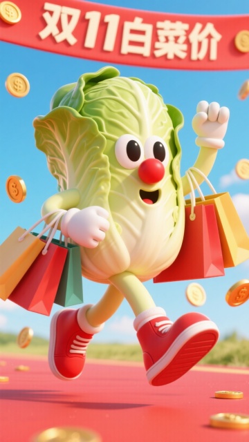 一个白菜拟人的美式复古卡通角色,手里拿着很多购物袋,一只手举起来,椭圆大眼,红鼻子,白手套,红色的鞋子,红色的地面,整体的气质和材质可爱,整体造型圆润,身体呈淡黄色。四周点缀了一些金币。蹦蹦跳跳地跑过来,背后飘着的横幅上写了“双11白菜价”,晴天。高饱和色彩。