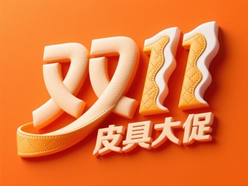 中间主标题”双11"",副标题” 皮具大促"",字体是庄重的,文字的表面是浅卡其皮革的质感,橘色背景,高饱和色彩。