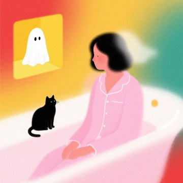 一个女人坐在一个粉色的浴缸里。浴缸里的水呈淡粉色,有一只黑色的猫坐在浴缸的边缘,背景是由多个色彩鲜艳的方块组成的,包括黄色、红色、绿色等,黄色的方块里有一只白色的幽灵。