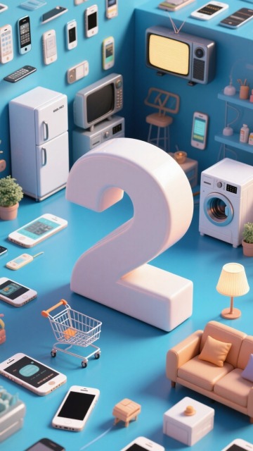 巨大的3D数字“2”,背景为手机、冰箱、电视、洗衣机、购物车、灯具、沙发组成的场景