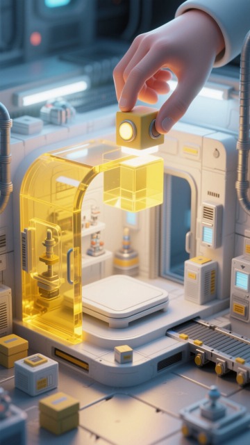 微缩场景。主体是一个黄色透明实验室,内部设置白色平台,实验室一半打开。周围有传送运输的迷你盒子,一只巨大的手点亮立方体上方的灯光按钮。明亮的趣味科技氛围。