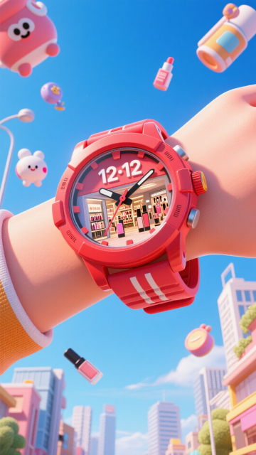 手腕上的手表特写,微缩视觉。画面主视觉是巨大的手腕上带着的一块红色手表,表盘上有“12·12”的文字,表壳与表带色彩鲜艳,表盘内是微缩美妆商场场景,精细呈现;手表佩戴在手腕上,背景是户外蓝天,点缀着城市建筑远景,空中漂浮着美妆商品和萌趣小物件。