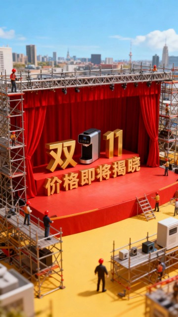 "微雕艺术,微距摄影,一个大舞台搭建的场景,中央金色立体大字两排:第一排:""双11”;第二排:“价格即将揭晓"",红色幕布拉开,图片上的物体在舞台上,舞台周围环绕着大面积脚手架,上面还有带着红色安全帽的工人,背景是澄澈蓝天与细节丰富的城市景观,红黄色的主色调,俯瞰角度,促销氛围