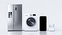 画面主视觉是一家双层电器店,门店招牌挂着“11·11 狂欢季”,一楼摆放白色冰箱、微波炉、电饭煲等厨房家电,二楼摆放电视机、音响、电脑等娱乐设备,周围环绕着金币、红包、热气球等元素,电商红色氛围。