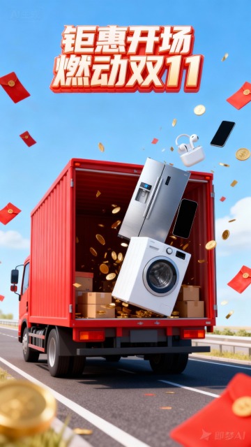 画面核心为红色卡车侧后视角,车厢向后“打开”,大量图示产品从车厢掉落而出,占据主视觉。车厢内有货箱点缀。搭配红包、金币、金色碎片元素。明亮天空加公路背景。顶部立体字“钜惠开场 燃动双11”。