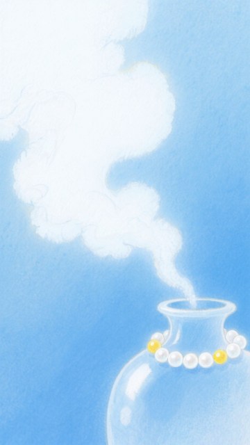 混合细腻彩铅质感的低饱和蓝色系(从淡蓝平滑过渡到普鲁士蓝色)背景图:从画面右下角露出一点点花瓶口局部(圆润、质感细腻,搭配珍珠串(白珠为主、黄珠点缀)),花瓶口溢出发光的白色流动的云向左上飘。主体居右下区域,上方与左侧保留留白,增强画面呼吸感