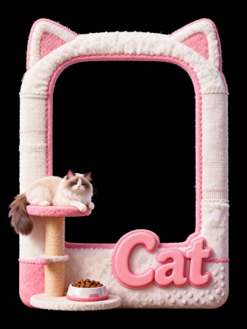 边框为猫窝的轮廓,白粉色调,融合玩具模型,左下角布偶猫在猫爬架上面,猫爬架下面有个猫粮盆;边框环绕短绒材质、帆布材质与橡胶纹理,标有 “Cat” 大字字母。