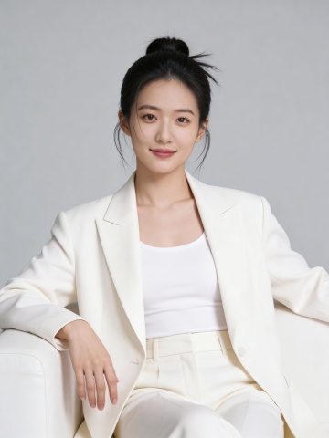 大气白色西装坐姿女士形象照