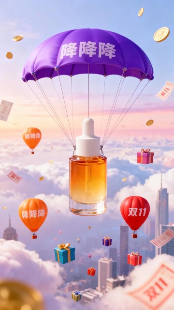 3d写实风格。画面中央是一只紫色降落伞,挂着图片上的主体。降落伞上印有“降降降”字样,小热气球飘浮在空中,同样写着“降降降”,一个是橘色的,一个是红色的。从高角度视角看去,天空中仿佛有无数五彩的礼物盒随着降落伞飘落。梦幻的天空为背景,云层中隐约出现高楼大厦。空中飘浮着金币、写着“双11”的券。