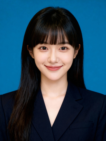 参考图一生成画面:证件照标准样式;美颜轻度磨皮,穿着高级深色V领西装,韩系妆容;参考图二的人物占位和比例;居中平视正面视角,纯正面,胸部以上半身像;去除一切饰品(如发饰、耳饰、眼镜、耳机等);光线均匀柔和,画质清晰,表情自然,头部完整,去除人物之外的所有元素,简约蓝色背景;严格按照图一的内容生成。