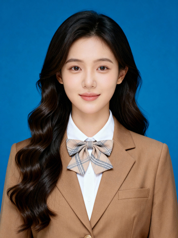 参考第一张图保留人物脸型和发型特征生成证件照标准样式;美颜轻度磨皮,柔顺卷发披发有光泽,发丝自然微卷,外穿暖咖色学院风西装,内搭白色翻领衬衫,浅咖暖色与细暖灰色相间的格纹领结,淡妆,发丝柔顺有光泽;参考第二张图的人物占位和比例,居中平视正面视角,纯正面,胸部以上半身像;去除一切饰品;光线均匀柔和,画质清晰,表情自然,头部完整,去除人物之外的所有元素,简约蓝色背景;严格按照第一张图的内容生成。