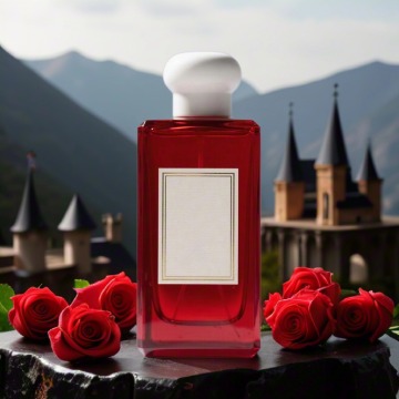 产品为主体,在一块乌木上,瓶身边放着很多红色玫瑰,远处是城堡和山,背景模糊,整体氛围暗色神秘