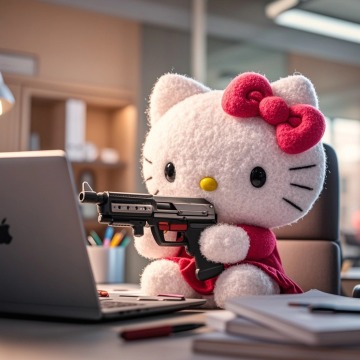 猫猫在大楼前很生气,头上冒火,拿着ak