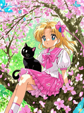 坐在树上的魔法少女,旁边是只俏皮的黑猫,树影斑驳,粉色花瓣飘落,背景是樱花