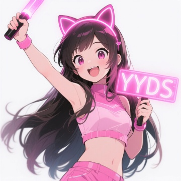 长发可爱女粉丝,半身,穿着潮流粉色配色服装,表情开心激动,左手拿着粉色辉光应援棒,抬手挥舞;右手拿着发光的灯牌,上面写着“YYDS”;发光猫耳头箍;白色背景