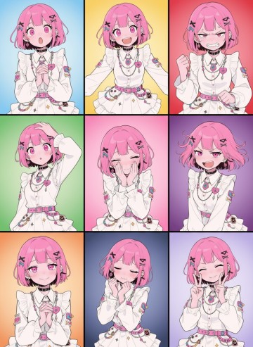 保持人物主体不变,创作一组表情包,包含表情不同、姿势不同的九宫格表情包,动漫风格
