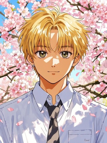 一个帅气的少年,金发碧眼,帅气阳光,白色衬衫,打领带,型男发型,白皙的皮肤,面部特写,树影斑驳,粉色花瓣飘落,背景是樱花