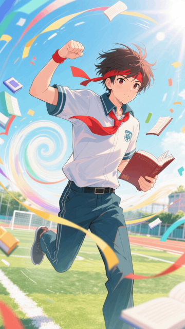 一位穿着中国校服的帅哥(红色发带,头发随风飞扬,眼神坚定自信。右手握拳抬起,左手拿着书本)身体呈现出奔跑的姿态朝镜头冲来。背景是阳光明媚的操场,动感的漩涡在少年身后,漩涡周围漂浮着教育元素和彩带。