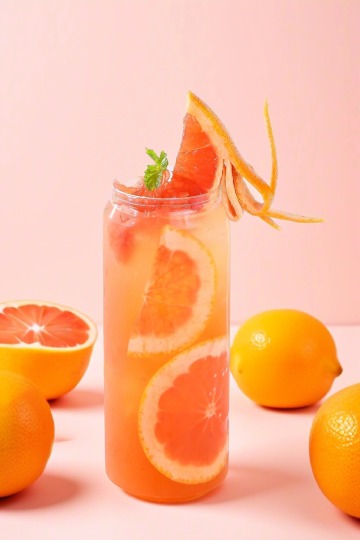 产品周围是几颗西柚。背景为淡淡的粉色