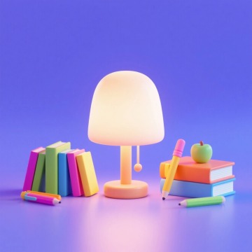 一个台灯,周围有书本、笔等装饰元素,画面撞色,紫色背景