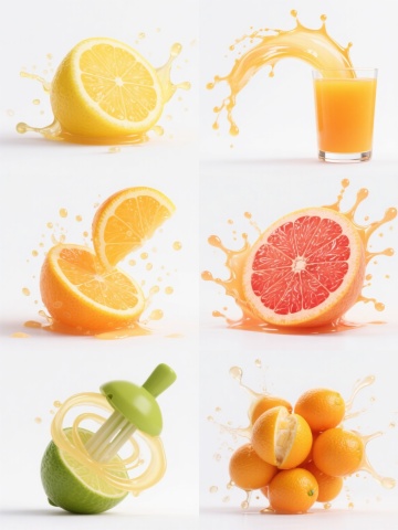 画面中心是主体置于木质台面上,布艺装饰,周围摆放着装有橙子、柠檬等水果的玻璃碗,还有玻璃杯装的饮品,背景有绿植和抽象装饰画,暖木色为主色调,光影柔和