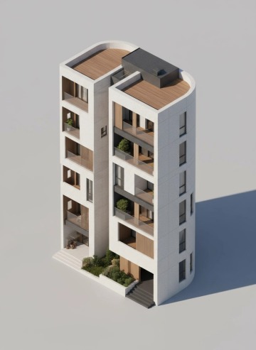 将此建筑的照片转换为圆形、可爱的等距3D渲染风格,保留建筑的突出特征,纯色背景。